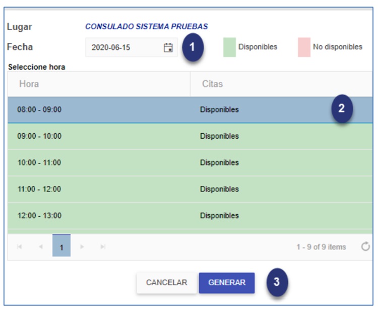 Paso 7: Seleccione la fecha y hora disponibles que mejor se acomoden a su agenda para la cita.