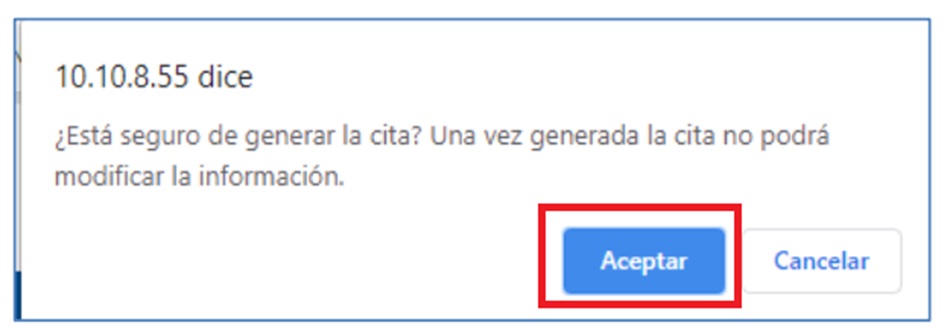 Paso 8: Confirme su cita haciendo clic en "Aceptar" una vez que haya elegido el horario más conveniente.